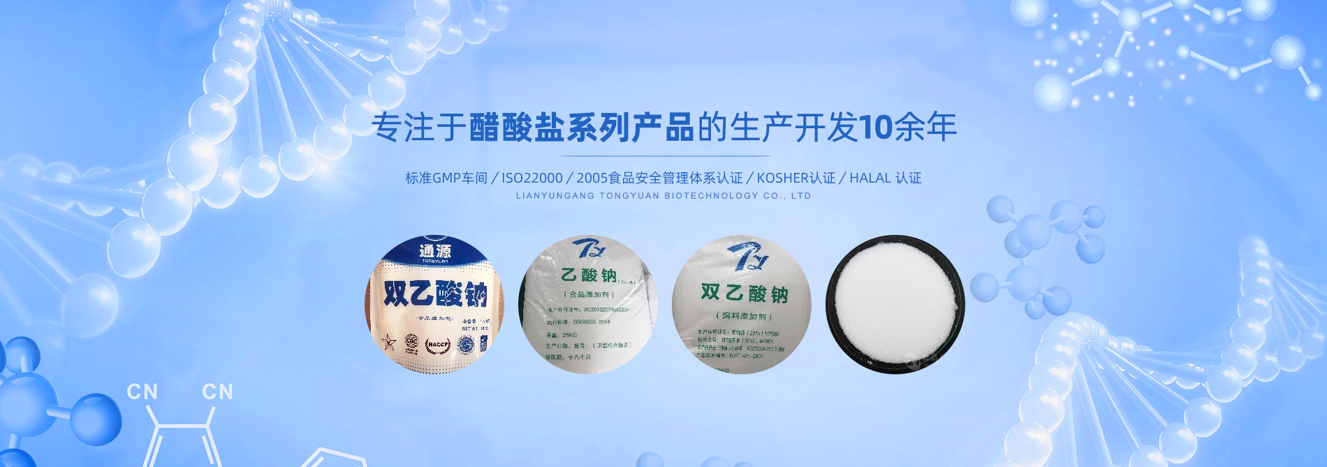 連云港市通源生物科技有限公司 是生產(chǎn)雙乙酸鈉、無水醋酸鈉、三水醋酸鈉、醋酸鉀、乙酸鈉、丙酸鈉、丙酸鈣和氯化鉀等系類醋酸鹽產(chǎn)品的專業(yè)制造商。公司專注于醋酸鹽系列產(chǎn)品的生產(chǎn)開發(fā)10余年,是國內(nèi)專業(yè)醋酸酸鹽產(chǎn)品生產(chǎn)基地。 目前,我們已和全球30多個國家和地區(qū)建立長期的業(yè)務合作關系,是中國較大的雙乙酸鈉生產(chǎn)商和出口商之一。作為中國食品添加劑和配料協(xié)會理事單位,通源公司已建成標準GMP車間5000余平方米,通過了ISO22000:2005食品安全管理體系認證、KOSHER認證、HALAL 認證等,這些都是我們提供高質(zhì)量產(chǎn)品和優(yōu)良服務的前提和確保?! ∩a(chǎn)出色產(chǎn)品,提供優(yōu)良服務,滿足顧客需要,是我們努力的目標。愿和我們的朋友們攜手,共...